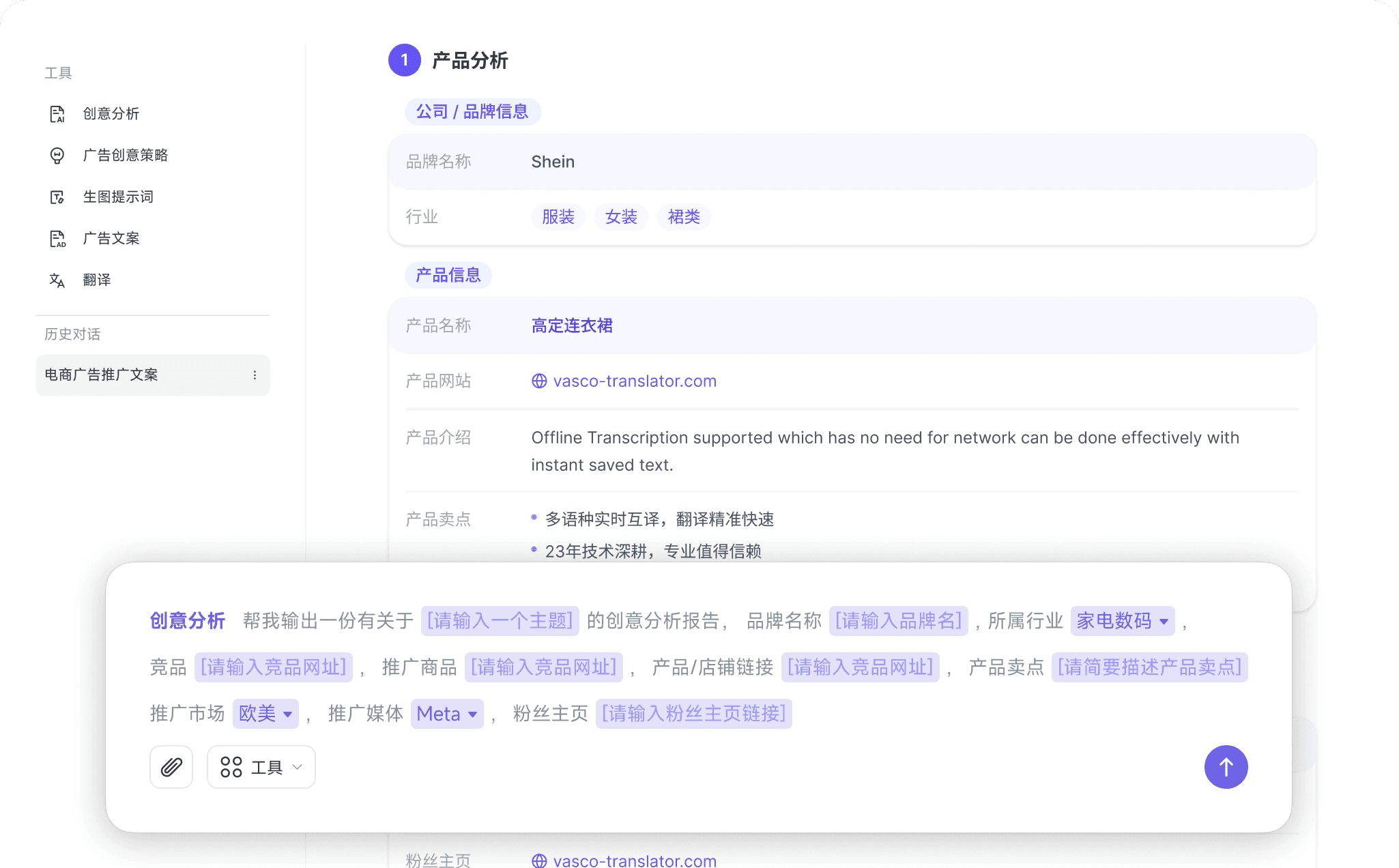填写结构化提示词模板或直接输入想法,AI 即刻洞察市场与用户偏好,一键生成创意分析报告,适用于竞品分析、投放分析等场景