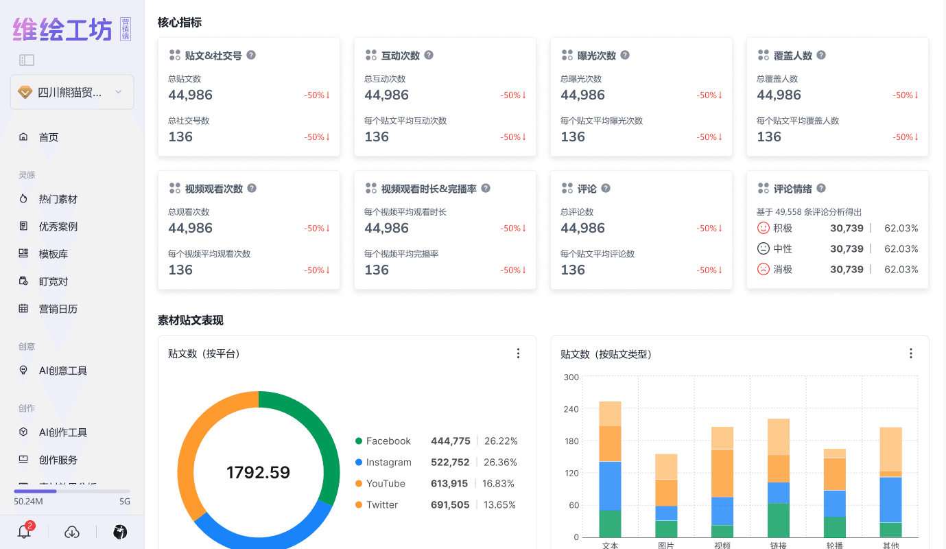 支持图片/视频/文案等多类型素材,实时监测曝光、浏览、ROI、成本等核心数据